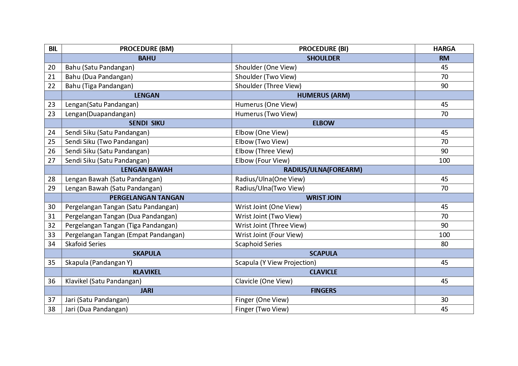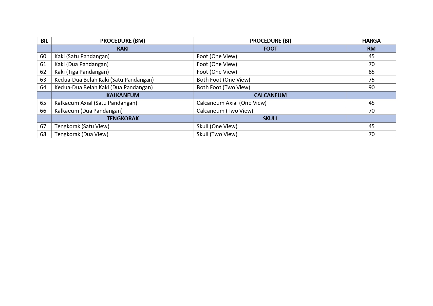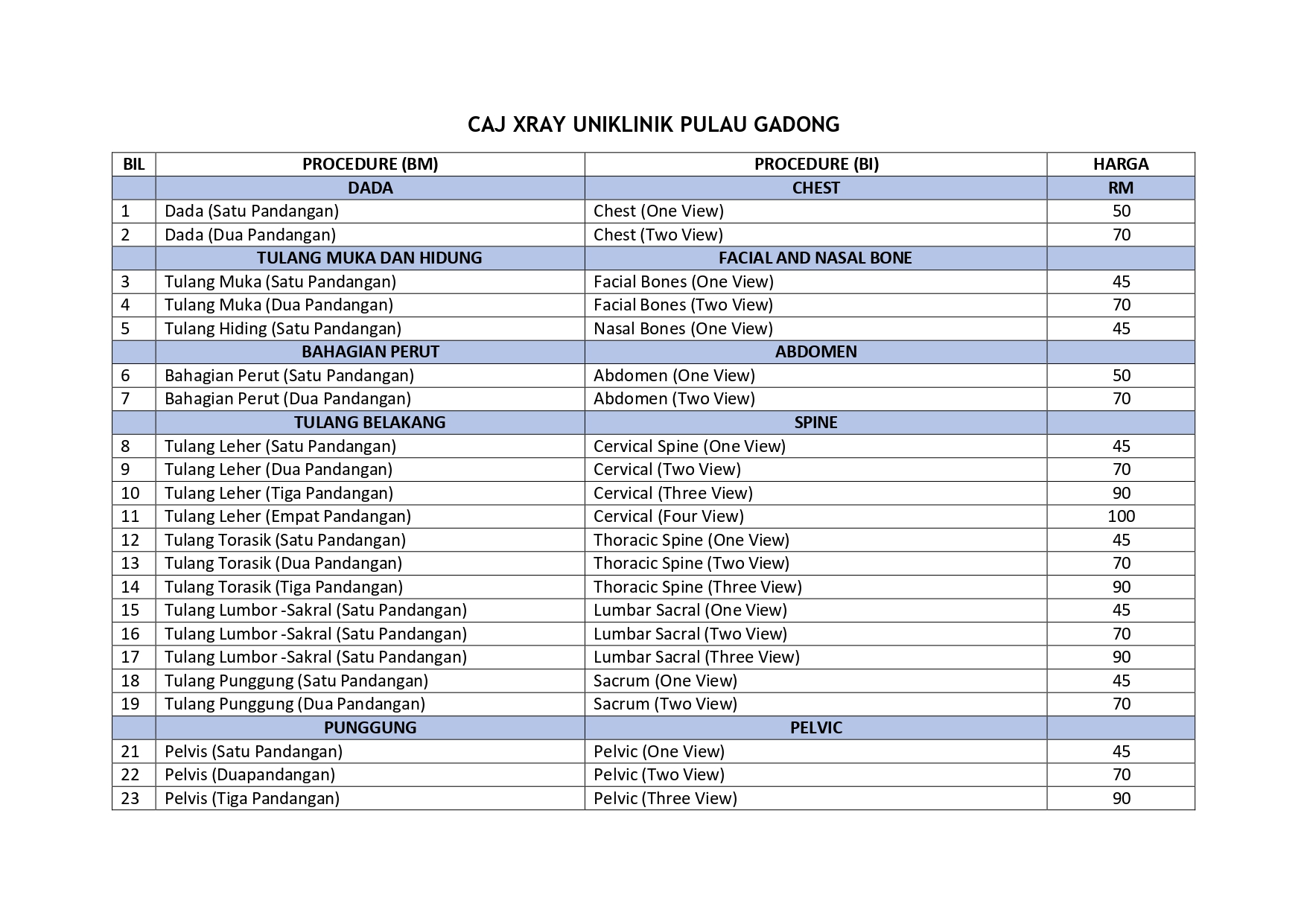 Lihat di bawah pakej-pakej X-Ray yang disediakan di U.N.I Klinik Pulau Gadong, Melaka.